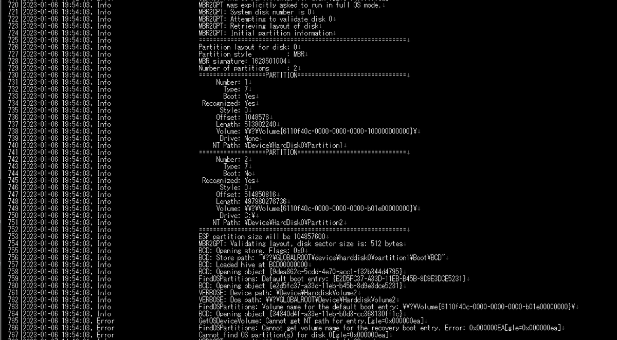 なんかおかしいと思ったのはつい先日のこと、久々にMBR2GPTをやってみてもダメで今回はちゃんとログを見てみるかと思ったところこんなログでした。